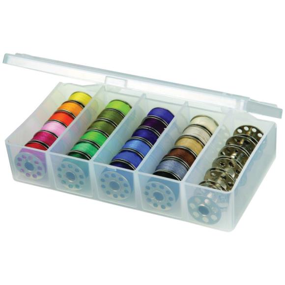 Bobbin Box is ideal for storing all your bobbins or other small sewing notions. This clear plastic box stores up to 30 bobbins and securely closes with a snap lid.