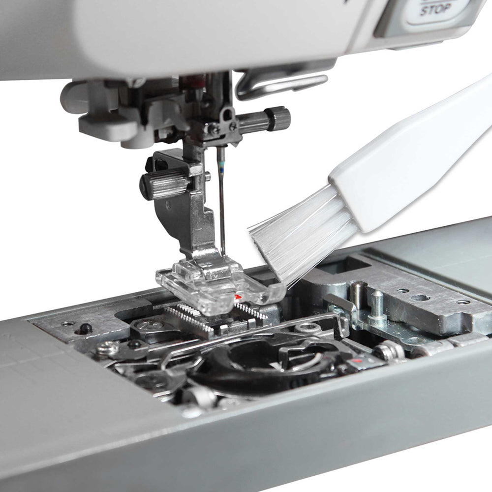 Lint brush ideal for cleaning bobbin cases, needle clamps, and presser feet.